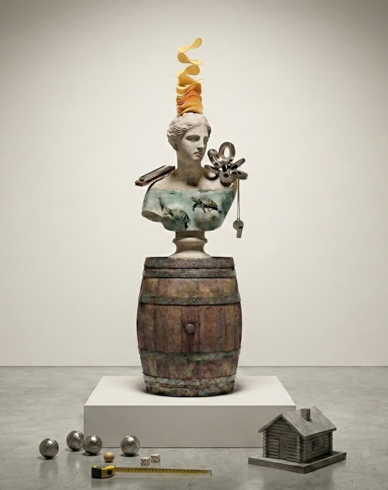 L’exposition de Stéphane Vigny à la galerie Fernand Léger, montre un ensemble d’une vingtaine d’œuvres, qui recouvrent la plupart des techniques abordées par l’artiste dans ses recherches. Ainsi, cohabitent des objets modifiés, des assemblages plus ou moins complexes, et des constructions intégrales. Dans cette exposition, une majorité d’œuvres de petits formats est présentée aussi comme des maquettes (Monument aux chips, Fuste, Pétanque dans la brume) en prévision d’un surdimensionnement et d’une possible destinée dans l’espace public. À l’image du dernier projet de l’artiste Obelixoidal, escalier hélicoïdal réalisé à partir de barriques bordelaises, présenté dans la dernière partie de l’exposition et du projet l’Équilibriste, (d’après le bouquetin imitant l’otarie) projet d’une œuvre dans l’espace public en cours de réalisation, dans le cadre de l’opération immobilière Acte VII à Ivry confluences en partenariat avec Emerige.