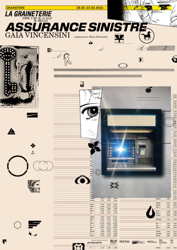 Visuel : Affiche de l’exposition de Gaia Vincensini « Assurance sinistre », La Graineterie – Centre d’art de la Ville de Houilles, 28 mars – 23 mai 2026. Commissariat : Marie Bechetoille. Conception graphique : Sarah Vadé.