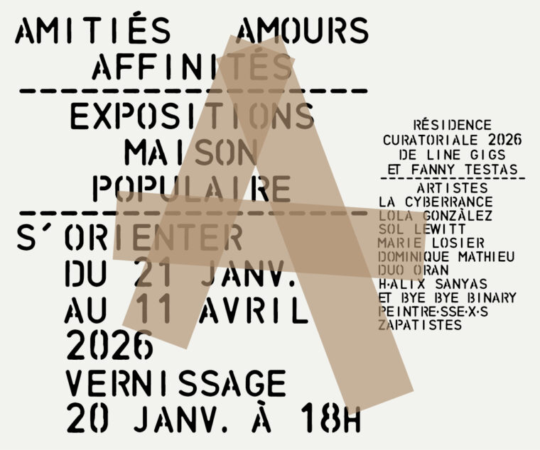 Ce premier chapitre réunit des artistes de différentes scènes et générations quis’orientent en art par affinités. L’exposition montre que de nos relations émanent de puissantes forces d’organisations. Les artistes et leurs œuvres racontent ces liens, les disent avec des mots (lettre de Sol Lewitt à Eva Hesse), les photographient et les filment (Lola Gonzàlez, Marie Losier et H·Alix Sanyas), les dessinent (tableaux zapatistes), les transmettent et les performent (Duo ORAN). L’artiste H·Alix Sanyas est en résidence de création numérique à la Maison Populaire tout au long de l’année 2026 en vue de finaliser un documentaire sur la collective Bye Bye Binary. Cette œuvre explore les liens entre création, amitié et militantisme. Des photogrammes du film sont exposés pour introduire sa résidence aux équipes, usagers et visiteurs.