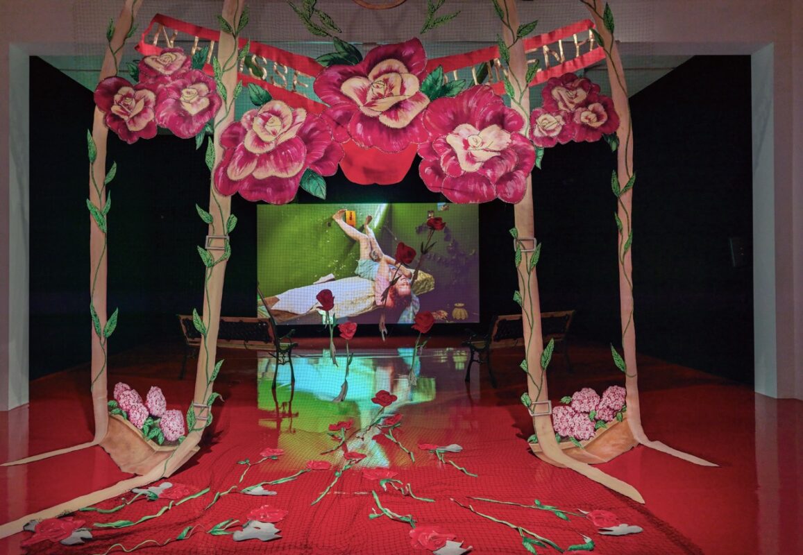 « Virages Vierges » désigne ainsi ces moments de bascule où corps, récits, croyances et constructions quittent les voies toutes tracées pour ouvrir, de manière irrévérencieuse et indocile, d’autres devenirs possibles. Cette exposition monographique d’envergure permet à Pauline Curnier Jardin de déployer sa pratique à travers une sélection d’installations majeures et de nouvelles productions. On y découvre ses atmosphères fantasmagoriques, entre théâtre, cinéma et rituel, au service de thématiques récurrentes : la fluidité entre vulnérabilité et puissance des corps, la place des femmes dans la société, ainsi que les formes de spiritualité et de syncrétisme populaires. Pour la création d’une nouvelle installation vidéo, l’artiste s’inspire d’un cinéma clandestin découvert en 2004 sous le Trocadéro (voisin du Palais de Tokyo) et surnommé « les arènes de Chaillot » – un lieu où inventer d’autres formes de liberté. Ce site résonne profondément avec son œuvre, nourrissant son attrait pour les espaces liminaires, les pratiques dissidentes et les récits qui échappent aux normes établies. Ce projet s’inscrit dans la continuité d’une relation au long cours entre le Palais de Tokyo et l’artiste, qui a précédemment participé aux expositions collectives « Dynasty » (2010, avec le musée d’art moderne de Paris) et « Anticorps » (2020).